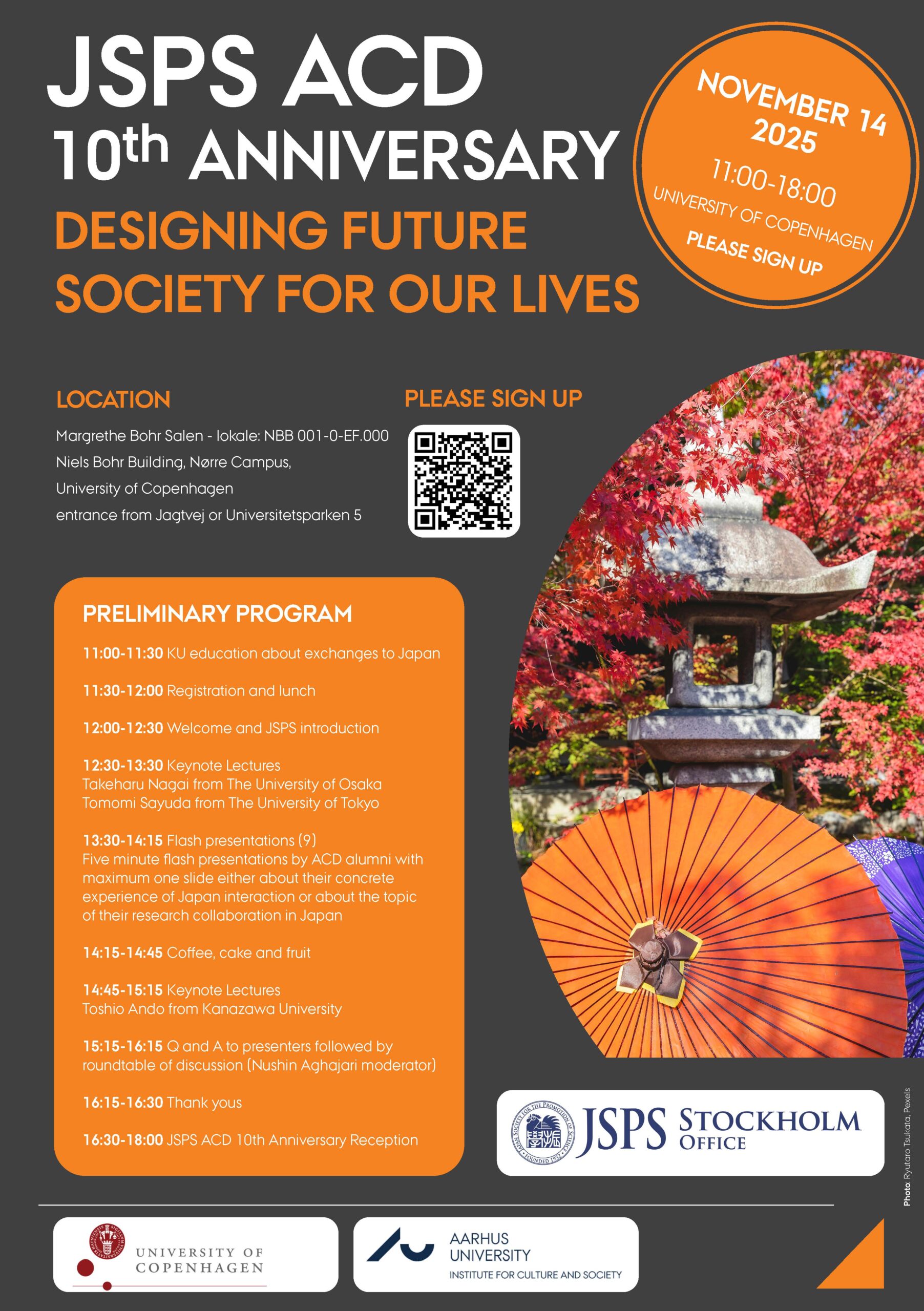 On November 14, JSPS Alumni Club in Denmark (ACD) 10th anniversary seminar “Designing Future Society for Our Lives” will be held at the Niels Bohr Building, University of Copenhagen.