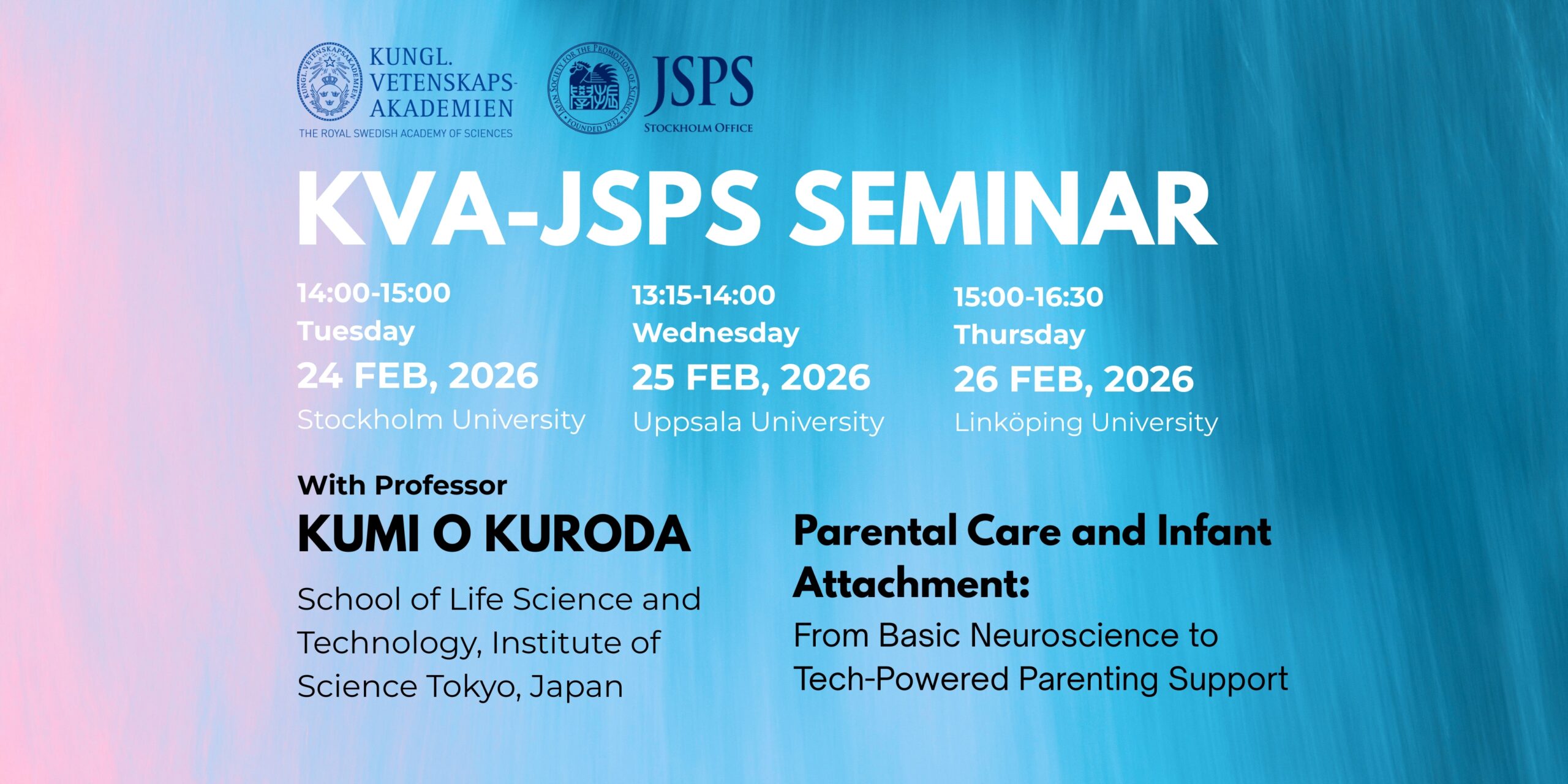 From February 24 to February 26, 2026, the Royal Swedish Academy of Science (KVA) and the JSPS Stockholm Office will jointly hold seminars at Stockholms University (Arrheniuslaboratoriet), Uppsala University and Linköping University. This year, Professor Kumi O Kuroda is invited to hold the lecture titled “Parental Care and Infant Attachment: From Basic Neuroscience to Tech-Powered Parenting Support ”